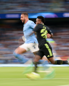 كان هناك ألم من مواجهة الموسم الماضي عندما تقدم سيتي بخمسة أهداف مقابل ثلاثة في مجموع المباراتين حتى الدقيقة 89 في إياب قبل نهائي البطولة ذاتها في سانتياجو برنابيو لكنه خسر بستة أهداف مقابل خمسة في النتيجة الإجمالية، وقال جوارديولا، الفائز بلقب دوري الأبطال مرتين كمدرب مع برشلونة، “عانينا من الألم في أحشائنا لمدة عام”، ومثلما حدث في العاصمة الإسبانية، سيطر سيتي على المباراة مبكرا فيما أنقذ كورتوا مرماه من فرصتين في أول 20 دقيقة من ضربتي رأس من هالاند، وكان محظوظا قليلا في الأولى وتصدى للثانية بشكل مذهل، وضغط سيتي بقوة ولم يتأخر اختراق دفاع ريال مدريد، حيث سدد سيلفا بقدمه اليسرى من الناحية اليمنى من داخل منطقة الجزاء في مرمى كورتوا، وكانت هذه المحاولة الثامنة لسيتي في أول 23 دقيقة من البداية، واحتاج ريال مدريد نصف ساعة ليشن أول هجمة على مرمى أصحاب الأرض وحتى ذلك الحين فاز كايل ووكر بسباق سرعة مع فينيسيوس جونيور ليقضي على هجمة خطرة، وأطلق توني كروس بعدها تسديدة بقدمه اليمنى ارتدت من العارضة بعدما لمسها إيدرسون حارس سيتي.