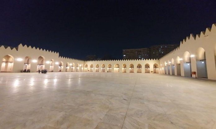 البحرية،ويمتد على مساحة ثلاثة أفدنة في منطقة الظاهر بحي الوايلي في شمال وسط العاصمة المصرية مما يجعله ثالث أكبر مسجد في مصر، وقال طارق محمد البحيري المشرف على أعمال الترميم إن المسجد خضع لعملية ترميم هندسية وكيميائية لإعادته إلى حالته الأصلية، وأضاف أن بعض الأجزاء تم تفكيكها لأن وجودها كان غير مناسب من الناحية الهيكلية، وأكد أن عملية الترميم حرصت على التجديد مع المحافظة على النمط الأثري، وتكلف الترميم 7،68 مليون دولار وبدأ عام 2007 وشاركت قازاخستان في تمويله.
