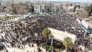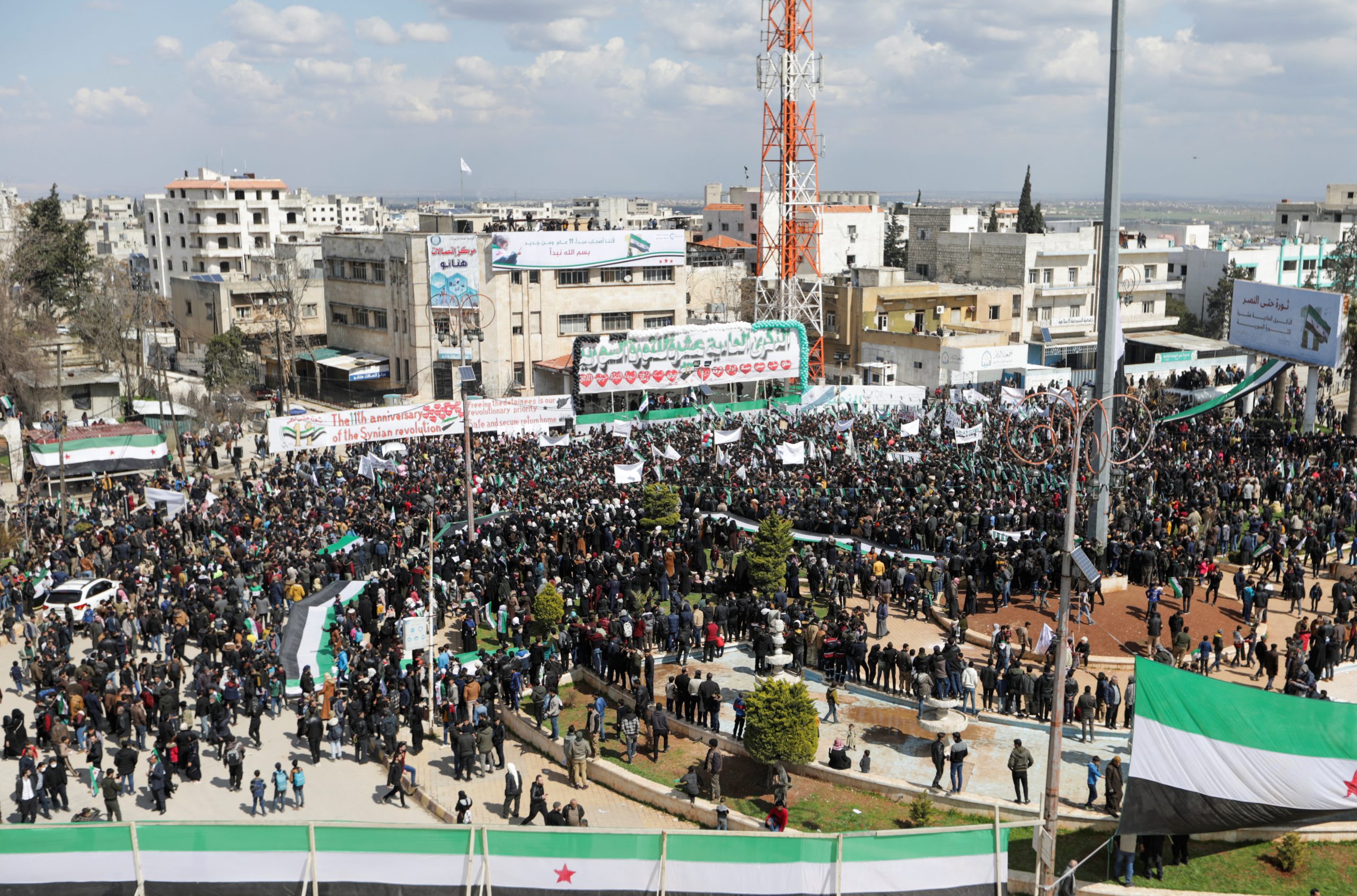 في مدينة إدلب، إحدى المدن الرئيسية التي لا تزال خارجة عن سيطرة القوات الحكومية، توافد مئات السوريين تباعاً، من صغار وكبار، الى ساحة رئيسية، حاملين رايات المعارضة السورية. ورُفعت على واجهة مبنى مشرف على ساحة التظاهر لافتتان، جاء في الأولى بالعربية “الشعب يريد إسقاط النظام” بينما كتب على الثانية بالانكليزية “الحرية والكرامة لجميع السوريين”، وقال متظاهر قدّم نفسه باسم أبو شهيد (27 عاماً) لوكالة فرانس برس “جئنا نحيي ذكرى الثورة، هذه الذكرى العظيمة على قلب كل سوري حر” مضيفاً “نفتخر بهذا اليوم الذي تمكنا فيه من أن نكسر حاجز الخوف ونخرج في وجه النظام المجرم”، وبدءاً من منتصفىشهر مارس 2011، خرج عشرات آلاف السوريين في تظاهرات مستوحاة من “ثورات الربيع العربي” مطالبين باسقاط نظام الأسد، لكنها سرعان ما تحولت إلى نزاع دام تنوعت أطرافه والجهات الداعمة لها. وباتت سوريا ساحة لقوات روسية وأميركية وتركية ومقاتلين إيرانيين، يأتي إحياء ذكرى الانتفاضة هذا العام بعد أكثر من شهر على زلزال مدمر ضرب سوريا وتسبّب بمقتل نحو ستة آلاف شخص في أنحاء البلاد، معمقاً من معاناة السكان، بعد سنوات الحرب التي تسبّبت بدمار البنى التحتية واستنزاف الاقتصاد.