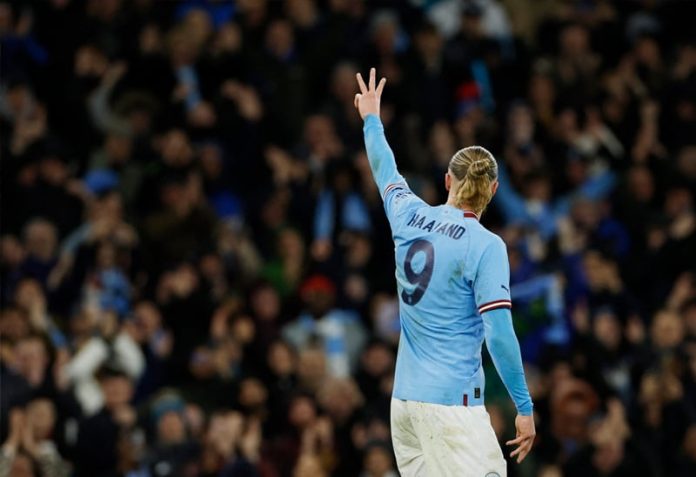 في موسمه الأول مع مانشستر سيتي، حطّم إرلينغ هالاند حاجز 40 هدفا بعدما أحرز ثلاثة أهداف خلال الفوز 6-صفر على بيرنلي في دور الثمانية لكأس الاتحاد الإنجليزي لكرة القدم، وبعد تسجيل خمسة أهداف أمام رازن بال شبورت لايبزيغ في دوري أبطال أوروبا الأسبوع الماضي، واصل المهاجم النرويجي التألق وهزَ شباك متصدر الدرجة الثانية في استاد الاتحاد.
